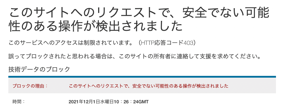 このサイトへのリクエストで、安全でない可能性のある操作が検出されました